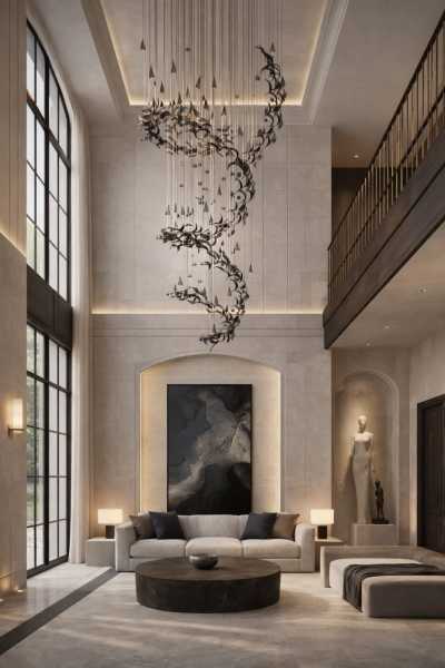 La verticalité joue ici un rôle essentiel. Dans un séjour en double hauteur, il est nécessaire de structurer visuellement le volume pour éviter une sensation de vide. Le luminaire agit comme un lien entre les différents niveaux, guidant le regard et créant un point d’ancrage central.